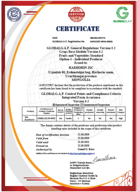 Agfo cert нь 15 жилийн түүхтэй, Турк улсын баталгаажуулалтын байгууллага юм. Agfo cert хөдөө аж ахуйн салбарынбаталгаажуулалтаар арвин туршлагатай бөгөөд Монголд анх удаа 2020 онд GlobalG.A.P стандартын баталгаажуулалтын аудитыгУвс хүнс ХК, Хар хорин ХК хийж, сертификат олгосон.